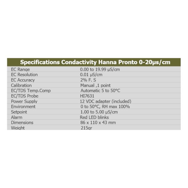 Το Condactivity Hanna Pronto είναι ένας μετρητής ηλεκτρικής αγωγιμότητας συνεχούς ροής, αδιάβροχος, υψηλής ακριβείας και με οπτικό σύστημα συναγερμού με LED. Είναι ένας διπλής πόλωσης αμπερομετρικός ανιχνευτής EC με ενσωματωμένο αισθητήρα θερμοκρασίας για αυτόματη αντιστάθμιση θερμοκρασίας και παρέχει μια γρήγορη απόκριση και υψηλή ακρίβεια μέτρησης EC. Περιέχει ηλεκτρόδιο με σπείρωμα 1/2″ και καλώδιο 2 μέτρων και τροφοδοσία 230V με μετατροπή 12V, λαμπάκι alarm σε περίπτωση που η αγωγιμότητα υπερβεί το εύρος μετρήσεων. Ιδανικό για εφαρμογές με μικρή και μεγάλη αγωγιμότητα όπως επεξεργασία νερού με αντίστροφη όσμωση αλλά ακόμα και για απιονισμένο νερό. Λόγω της μεγάλης ακρίβειας του μπορεί να χρησιμοποιηθεί και σε κάθε χημικό εργαστήριο, σε εργαστήρια γεωπονικής με υψηλές απαιτήσεις κ.α.
